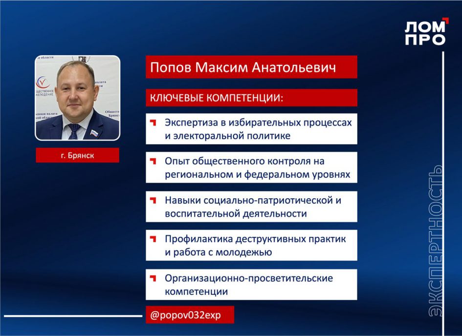 Участник Брянского регионального отделения Национального благотворительного фонда, заместитель председателя Общественной палаты Брянской области Максим Попов получил официальное признание своего профессионального опыта на федеральном уровне. 18 сентября 2025 года он был признан экспертом сообщества «ЛОМПРО» АНО «Продюсерский центр «Интеграция».
