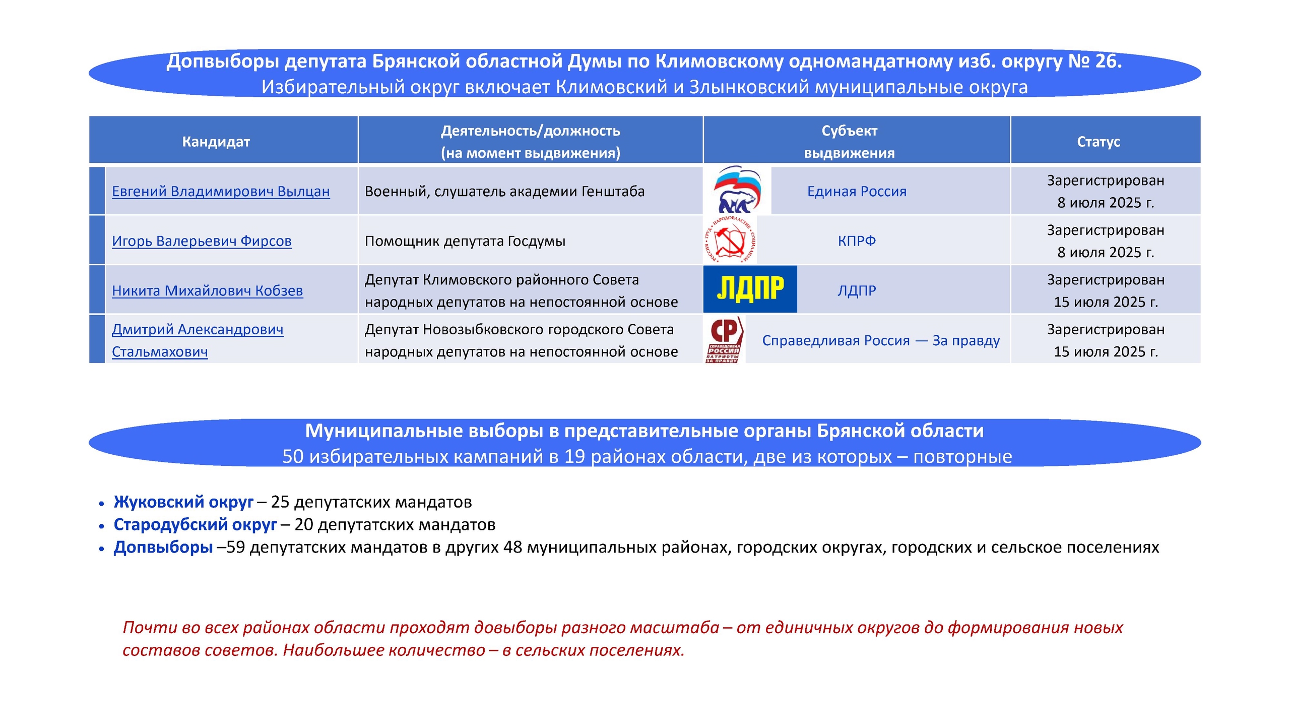 - Выборы в областную Думу: В Климовском округе за мандат борются четыре кандидата, среди которых военный, помощник депутата Госдумы и местные депутаты. Такое разнообразие, по мнению эксперта, позволяет избирателям сделать осознанный выбор.