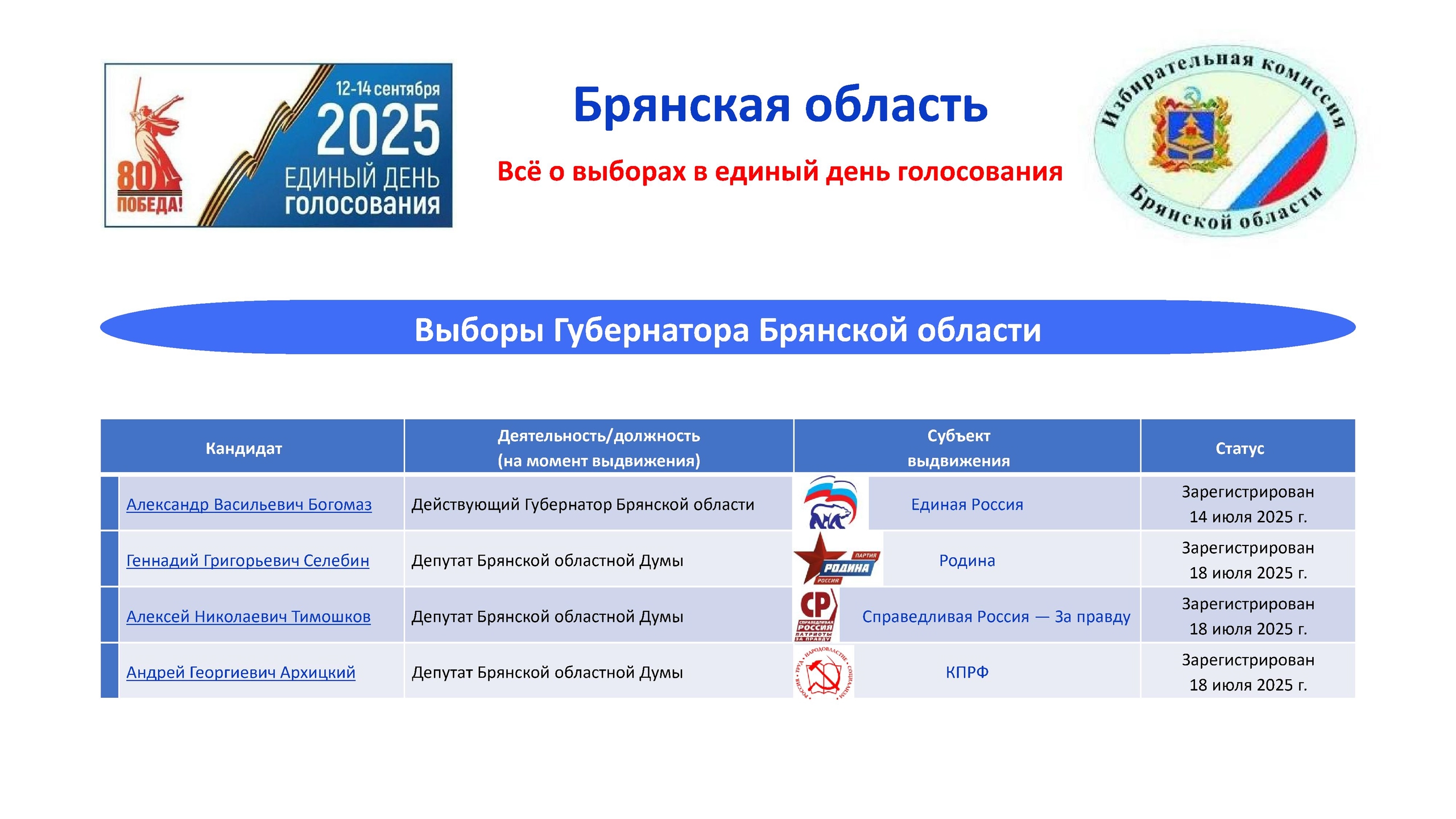 - Выбор губернатора: На высший пост региона зарегистрированы четыре кандидата от ведущих политических партий: действующий губернатор Александр Богомаз («Единая Россия»), а также депутаты облдумы Геннадий Селебин («Родина»), Алексей Тимошков («Справедливая Россия – За правду») и Андрей Архицкий (КПРФ). «Участие признанных лидеров, все из которых без проблем прошли регистрацию, — это показатель здоровой конкуренции и прозрачности процесса», — подчеркнул Максим Попов.