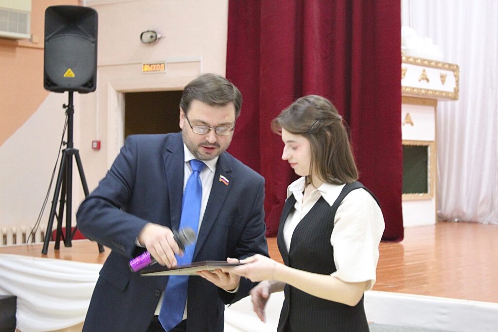 3 февраля 2025 года в брянской гимназии №4 состоялось торжественное вручение наград победительнице всероссийского конкурса стихов «Моя большая семья». Заместитель председателя Общественной палаты Брянской области, участник Национального благотворительного фонда Артем Сухоломкин вручил десятикласснице Варваре Грачевой Благодарность Общественной палаты Российской Федерации и экземпляры сборника, в который вошло её произведение.