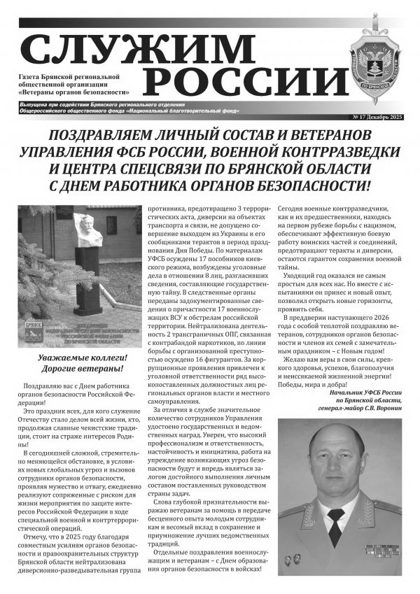 К профессиональному празднику — Дню работника органов безопасности Российской Федерации — вышел в свет новый выпуск газеты «Служим России». Издание выпускается Брянской региональной общественной организацией «Ветераны органов безопасности» при содействии Национального благотворительного фонда. В своей статье редакция рассказывает об истории… Читать далее →